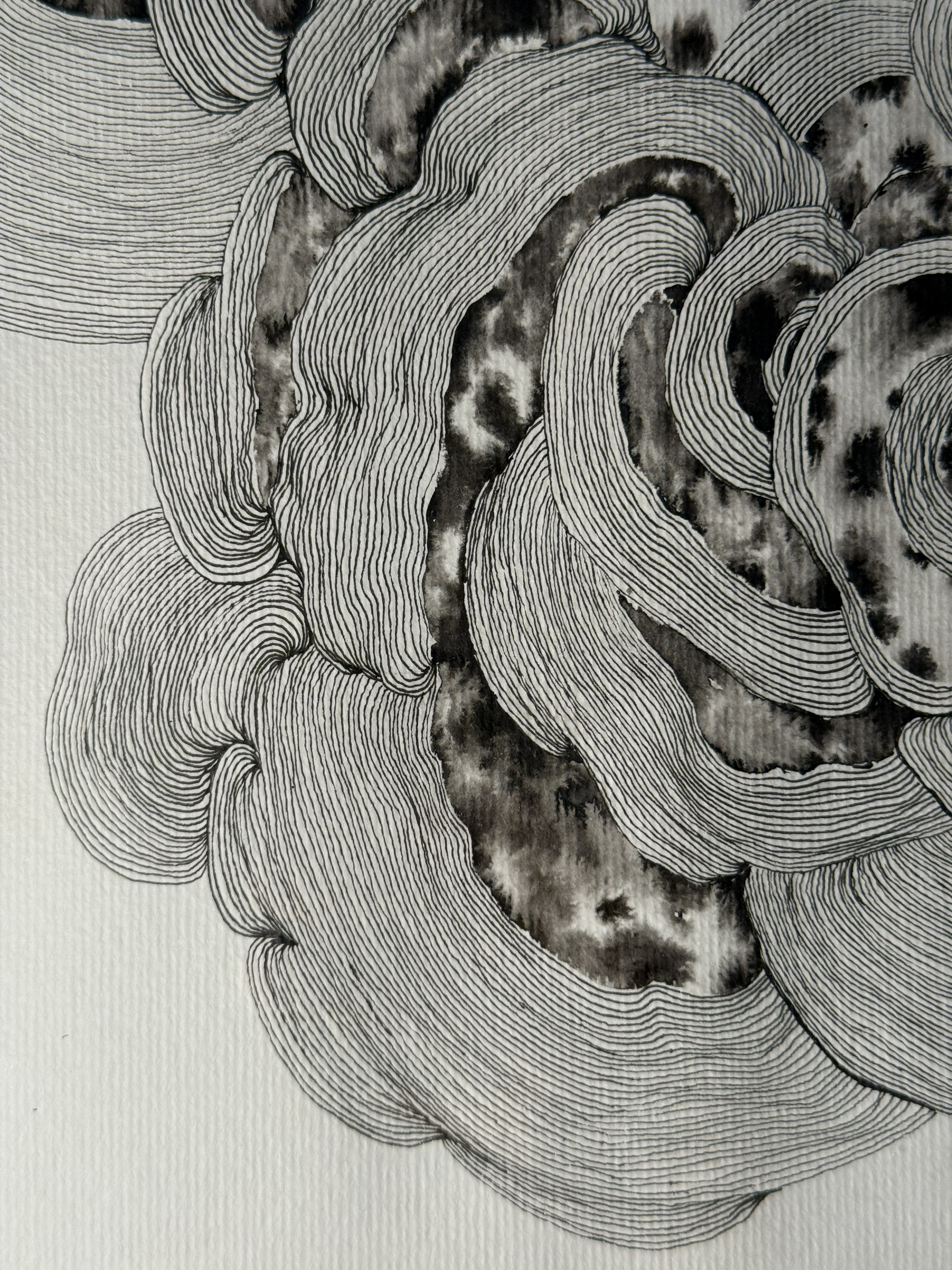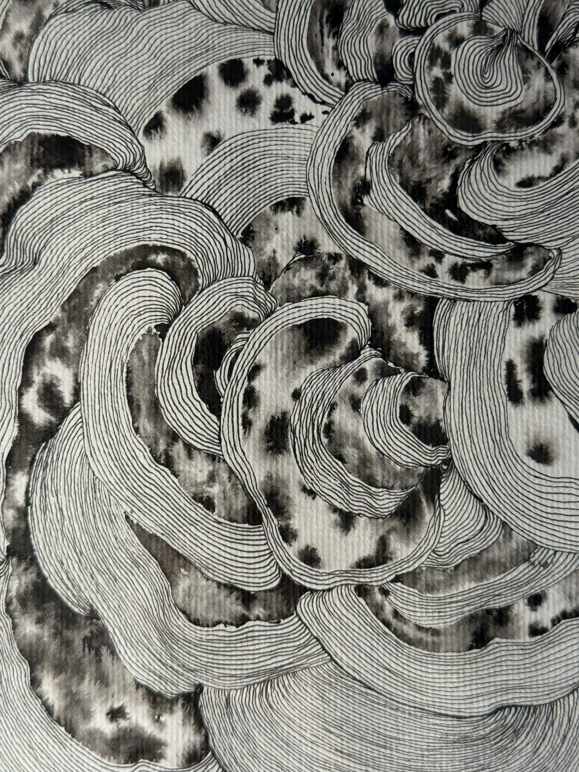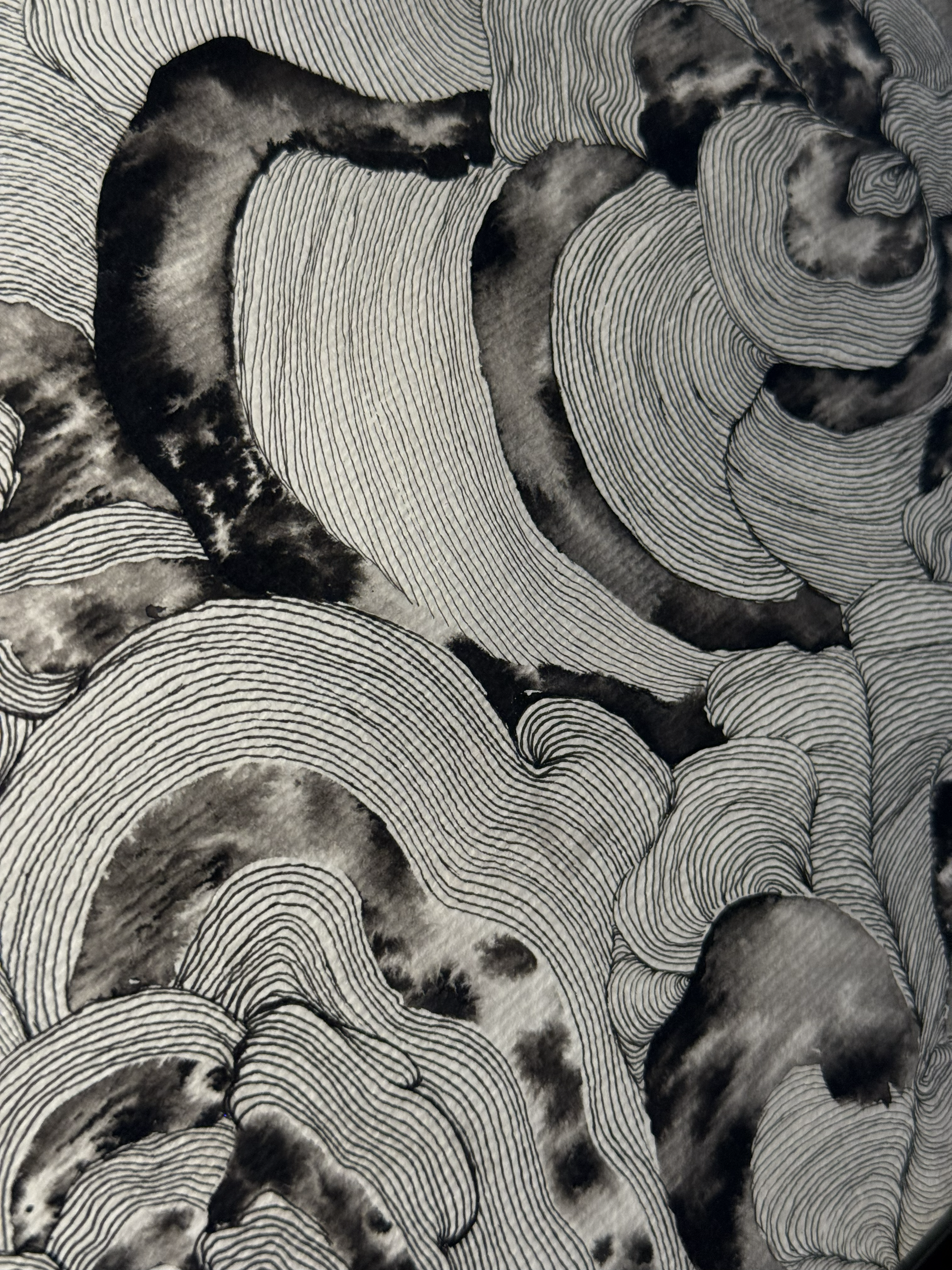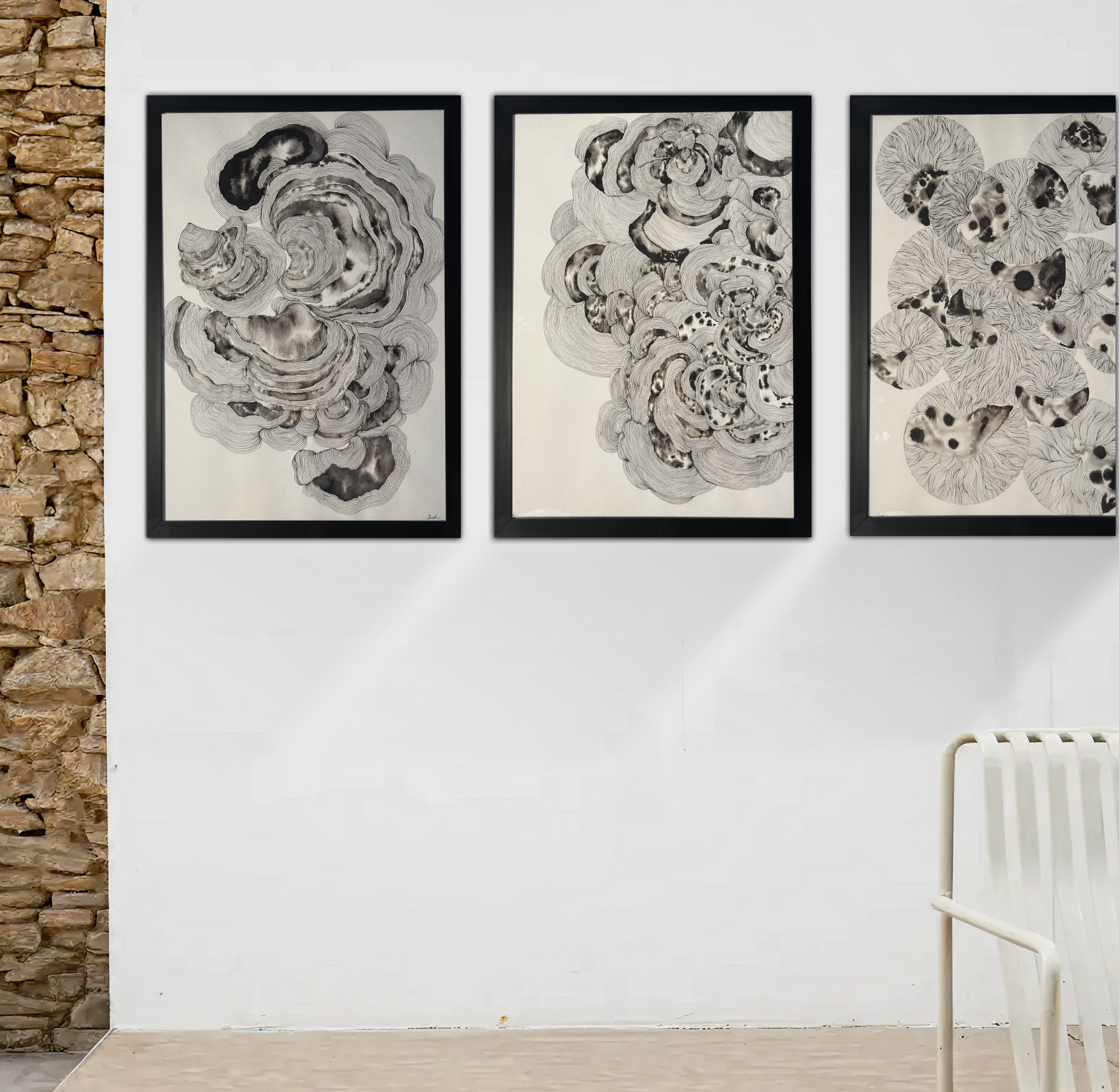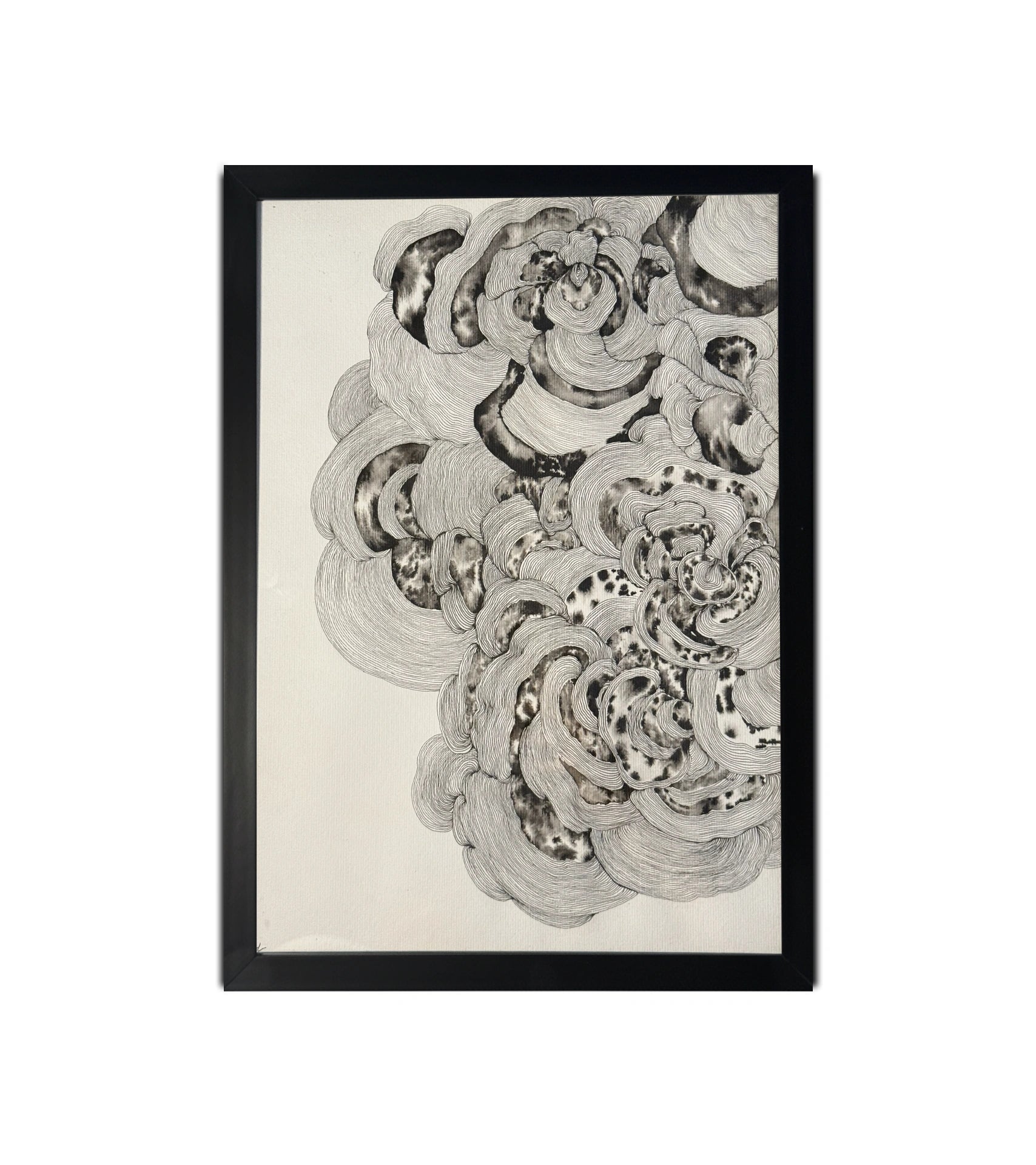 "II. ECOS DE MIM" é a segunda obra da série que explora as camadas da identidade através do nanquim. Nesta peça, o movimento se intensifica - as formas orgânicas ganham ritmo, criando uma dança visual hipnótica que evoca a complexidade das transformações internas.